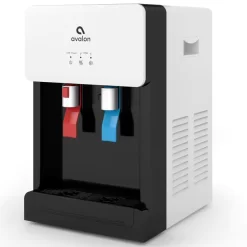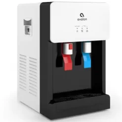 The Avalon Countertop Hot/Cold Water Cooler is made with innovation and style. The easy-to-use paddle spouts make it so much more convenient to use. Simply press your cup against the paddle to let the flow of water to come out. The machines highly efficient compressor makes the cold water crisp and ice cold at approximately 47° F without the need of adding ice cubes to your drink. The hot faucet is hot enough to cook one’s tea or coffee or any other steaming hot beverage at approximately 185° F. Due to the extremely hot water, we’ve added a child safety lock on the hot water faucet. There is a built-in nightlight making the water spouts clearly visible in the dark. This water cooler is bottle-less with an NSF certified activated carbon filter and a sediment filter with a water line that can be attached to your water source. There is also a built-in leak detector to automatically monitor the water flow from the water source into the machine. We have incorporated a self-clean ozone function which will automatically clean the machine’s water tank with the injection of ozone by the press of a switch. The dispensing area is 10×2.5×9.5 in. with 7.5 in. of space below the spouts. The water cooler is UL listed and complies with all standards of Energy Star. Setup is easy and the unit can be connected directly to your existing sink water line. All parts necessary for installation are included. The unit dimensions are 12x12x19 in.