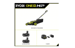 This mower includes convenient features like a single point height adjustment, 2-in-1 mulching and bagging functions, and easy lift bag removal. The compact, lightweight design makes it easy to carry from one place to another, and the handles fold for convenient, vertical storage when the job is done. This mower is also equipped with (2) 4.0 Ah batteries and charger that are compatible with over 260 RYOBI 18V products. This tool is backed by a 3-Year Limited Warranty.