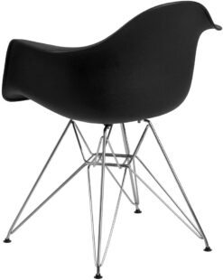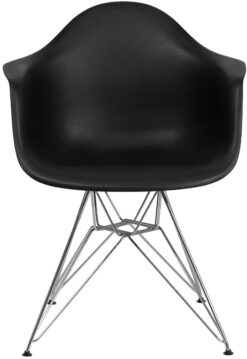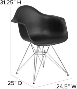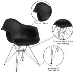 Add charm and presence with this aesthetically pleasing accent chair. Smooth, gentle curves provide style and conforms to your body allowing you to sit comfortably. The durable matte plastic molded chair and geometric chrome base add an artistic appeal. You can instantly modernize your living room, kitchen or dining room, mixing it up with different colors. The versatility of this chair will have you in the office negotiating deals and in the home kicking back spending time with the family. This graceful arm chair is well suited to complement any setting as a single chair or pair. The geometric braces below the seat not only add to the contemporary style of the chair, but they also provide extra stability and sturdiness. The 4 adjustable non-marring floor glides protect your floors from scuffs and scrapes by sliding smoothly when you move them.