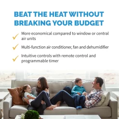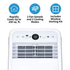 - Compact portable air conditioner quickly and evenly cools up to 200 square feet