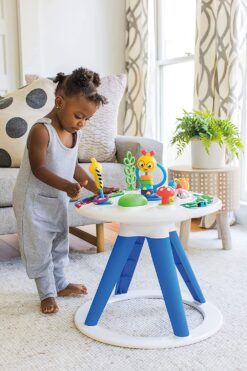 - 4 modes to grow baby’s curiosity: Walk-Around Discovery Center; Discovery Table; Art Table; Removable Floor Toys