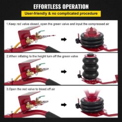 VEVOR pneumatic jack is designed tough and built to last. With 3-tons/6600 lbs. capacity, a lifting range of 5.5 in. to 15.7 in. and a lifting time of only 3-seconds to 5-seconds, this triple bag air Jack is compact, powerful and very fast to use. Inflated with compressed air, they are easy to handle. The pneumatic jack is one of the most useful tools in the body shop.2