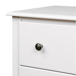 - Crisp white laminate finish with dark pewter-finished metal knobs