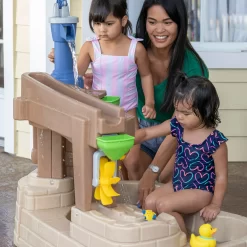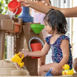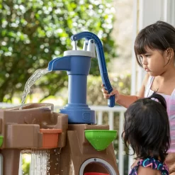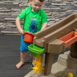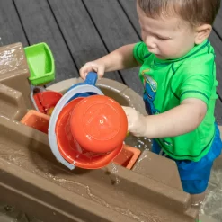 - Swiveling water pump activates three areas of water play: down a channel to a funnel, spinner, and lazy river; a waterfall “rain showers” effect tray, and into a fill-and-spill bucket.