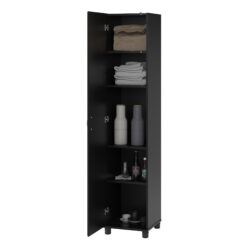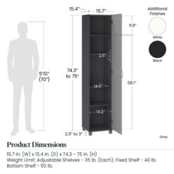 Add extra storage space to any room in your home with the Systembuild Evolution Kendall 16” Storage Cabinet. Made of laminated MDF and particleboard, the water resistant black finish is easy to clean so the Cabinet can be used anywhere. The interior of this Cabinet features 5 shelves, 3 adjustable, allowing you to customize your storage for both small and large items. Store and organize anything from office supplies to cleaning supplies and even kitchen pantry items. Soft close hinges are adjustable and prevent slamming doors. The adjustable feet make keeping your Cabinet level on uneven floors simple. A wall anchor kit is included to secure the Cabinet to the wall and prevent tipping injuries. Use this piece as a stand-alone item, or combine it with additional Systembuild Evolution Kendall storage items to create the perfect storage solution for your home. The Storage Cabinet ships flat to your door and 2 adults are recommended to assemble. Once assembled, the Cabinet measures to be 74.3125”H x 15.6875”W x 15.375”D.