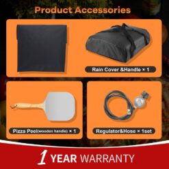 - Every geek chef pizza ovens comes with 1-pizza stone, 1-pizza crust, 1-rain cover, 1-regulator and hose and 1- owner’s manual