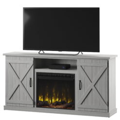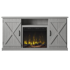 With this electric fireplace and TV stand combination, you can enjoy a stylish, modern farmhouse design during your family movie nights. An open media shelf holds your cable box, gaming console, or other AV components while side cabinets with adjustable shelves provide storage for your movie collection and electronic accessories. The cabinets and TV stand top feature a plank design with decorative saw cut X mullions on the doors for added rustic flair. For even more ambiance, use the electric fireplace to create a cozy atmosphere while warming up to 400 square feet of your home. The flame effects can be used with or without heat for the look of a gentle rolling fire all year long, even during warmer months. Choose between included contemporary fire crystals or a realistic log set with an ember bed to showcase the beautiful flames – both are included!