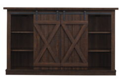 With the Terryville TV stand, you make a wise investment to hold your flat-screen TV up to 60 inches and up to 75 pounds and to add a great look to your home. Suspended barn-style doors that slide on a metal rail, plus a distinctive saw-cut look make this piece something special. The sliding doors conceal two cabinets with two adjustable shelves each, and the open, center shelf area has two adjustable shelves as well. The result is tons of storage space for cable boxes, DVRs, game consoles, other audio-visual equipment, and even knick-knacks you love. Holes in the back manage cord mess and add ventilation to cool electronics.