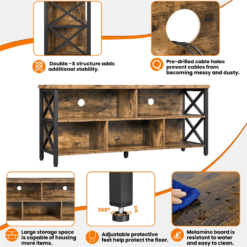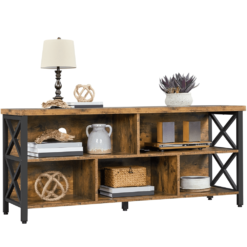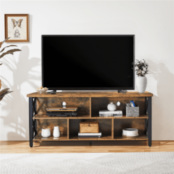 We are constantly vigilant for the latest furniture trends. Our industrial series reflects our approach to the surge in demand over the past few years for this industrial style. We see such a style not just as a trend that prevails but as the reveal of people’s yearning for emotional care and nourishment just as what these rustic, unadorned pieces that convey. We hope that our products are not just some pieces of cold furnishings but of warmth that can complement the style of your home and help create your home into a restful habitat to nest. This industrial TV console comes in 2 colors, rustic wood in higher saturation and grey in lighter tone. Both are made of high quality and durable particle board that’s been laminated. The sturdy iron frame is black matte coated and in the shape of a double X, not only reinforcing each side, but also counteracting the heaviness by adding airy expression. Our 55” industrial TV stand has 5 open compartments that come in 3 sizes. The 2 seamless large ones have pre-drilled cable management holes that can accommodate game consoles and the other 3 can house trinkets, souveneirs and more.