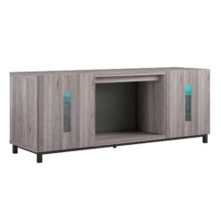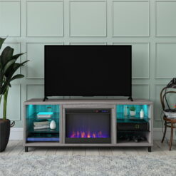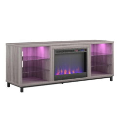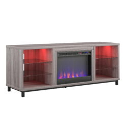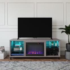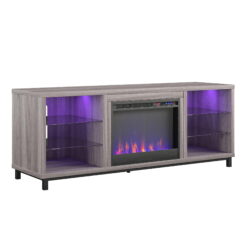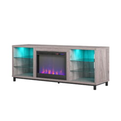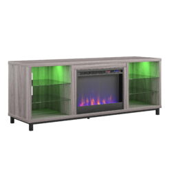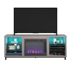 Step away from the ordinary and give your living room a modern makeover with the Ameriwood Home Lumina Deluxe Fireplace TV Stand. Don’t let the simple look fool you, this stand comes with a 23” electric fireplace insert with all the bells and whistles. Ready to warm up a 400 square foot room with the touch of a button, you can relax knowing that timers will take care of the rest. If you want to simply enjoy the look of the flames without the heat use the included remote to switch off the heat option and pick your flame brightness. The fun doesn’t stop there though. On either side of the fireplace insert are three shelves, 2 glass, that hold your entertainment components like gaming systems, a DVD player, remotes and more. Both of the side shelves are ilFendallted with LED lights with 7 different color settings to coordinate with the glowing fireplace. This Fireplace TV Stand has a mix of light walnut woodgrain laminated particleboard, MDF and hollow core construction with metal feet and tempered glass shelving. Combined together this stand makes for a very sturdy addition to your room. The top can hold up to a 70” flat paneled TV with a maximum weight of 120 lbs. Two adults are recommended to assemble this Fireplace TV Stand. After assembly, the stand measures to be 24.875”H x 64.75”W x 18.875”D.