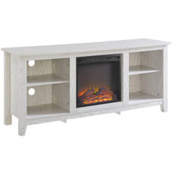 Display your TV in style with this 58-inch TV stand and electric fireplace. Crafted from high-grade MDF with a durable laminate finish for a rich, textured surface, this storage console features two adjustable shelves on both sides of the fireplace for anything from your electronics to your home decor. With a cord management port at the back of each shelving space, you’ll never have to worry about a tangled mess of wires as it’ll, keep them organized. This entertainment center mixes a traditional style with the on-trend rustic farmhouse look with its simple design and will be a classic piece to your living room. This media stand will accommodate most flat-panel TVs up to 64 inches. Installation for the fireplace requires no technician, simply plug into any standard household outlet.