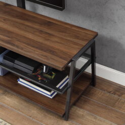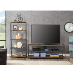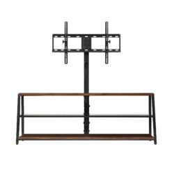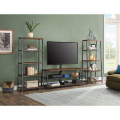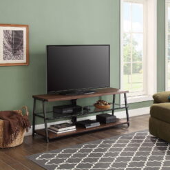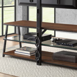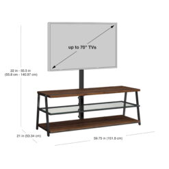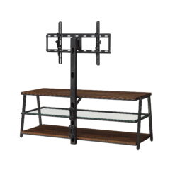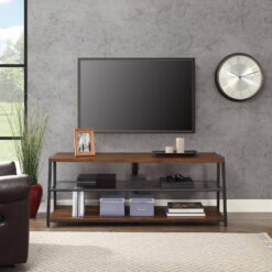 This Mainstays Arris TV Stand with patented 3-in-1 functionality offers three different options for displaying your flat panel TV. You can choose from a swivel mount, wall mount, or tabletop display. Create the perfect viewing angle with the swivel mount capabilities to pan 45 degrees left or right that supports most 70″ flat-panel TVs. Or keep it classic and display your TV mounted on the wall or on the tabletop that supports flat screens up to 65″. The medium brown tones of the Canyon Walnut finish and clean lines complement a variety of home decor styles, from contemporary to traditional and everything in between. A tempered glass middle shelf adds to the modern appeal of this media stand. Open shelves provide the perfect display and storage options for all your entertainment accessories. Conveniently placed cable wheels are great for organizing and concealing cables out of sight. Whether you choose to use the TV stand in your living room, game room, kid’s room, or any other area, this media center is perfect for any room in your home.