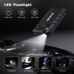 - MULTIFUNCTIONAL LED LIGHTS – The battery starter built-in 3 adjustable LED light modes, including flashlight, emergency strobe light and SOS light. The multi-purpose flashlight and built-in compass is great for outdoors, especially for some emergencies or in extreme temperatures for assitance and lighting.