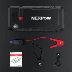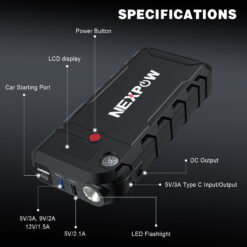 - VISIBLE LCD DISPLAY – Compared with traditional portable jump starters with indicators only, NEXPOW visible LCD screen portable jump starter clearly displays the battery information you need. The unit needs over 25% of power to start a dead battery to prevent demage the vehicle and jump strter. A digital LCD screen gives you a heads-up on current battery power remaining when the unit is turned on.