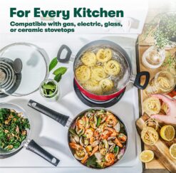 - COMPATIBLE WITH ALL STOVE TOPS: Our nonstick pots and pans set is compatible with all types of stove tops–gas, ceramic, electric, you name it! The see-through lids allow you to keep an eye on your food while you’re cooking, and the vents keep the steam out
