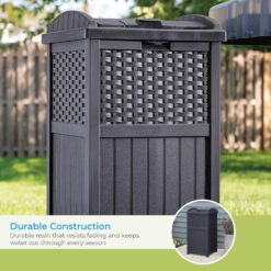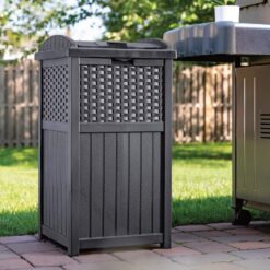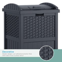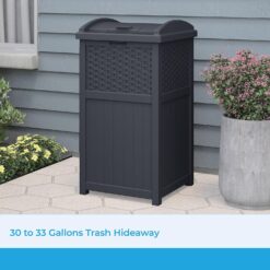 Keep unsightly garbage out of view with the Suncast 33 Gallon Resin Outdoor Hideaway Patio Trash Can. This patio trash can features a decorative wicker-style design for a stylish addition to your outdoor space. The decorative and functional waste bin is compatible with standard 30 gal. garbage bags for easy and convenient use. This trash can also features a secure latching design to help keep trash in and critters out. Constructed from durable resin that resists fading, this trash can is built to bring provide long-lasting use on your porch or patio. The Suncast 30 Gallon Resin Outdoor Hideaway Patio Trash Can measures 16″ x 15.75″ x 31.7″ to keep your porch clean without taking up too much space. Suncast takes pride in helping customers enhance their indoor and outdoor spaces with quality products that are stylishly designed. You take pride in creating a beautiful environment. We take pride in keeping it that way.
