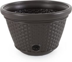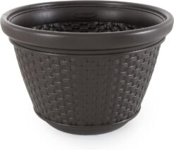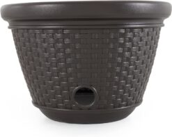 Suncast Plastic Wicker Outdoor Garden Hose Storage Holder Hideaway Pot for 100 Foot Long Hoses with 4 Drain Holes for Porch or Garden, Java