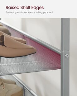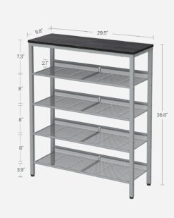 - [Holds More Shoes] This 5 tier shoe rack can hold 16-20 pairs of shoes with the top board; the distance between each of the 4 mesh shelves is 8″ to fit heels and high tops on the shelves