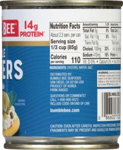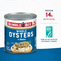 - CONVENIENT & VERSATILE: Enjoy Bumble Bee canned oysters as a great-tasting, protein-packed snack or a quick meal—easily prepare a delicious lunch or dinner with premium Bumble Bee whole oysters