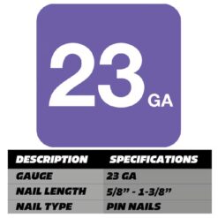 - FASTENERS: 23-gauge headless pins with automatic adjustment for 5/8 In, 3/4 In, 1 In, 1-3/16 In and 1-3/8 In fastener lengths