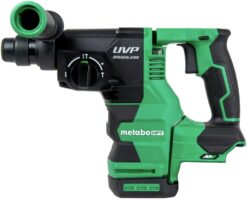 The 36V MultiVolt Brushless 1-1/8″ SDS Plus Rotary Hammer with UVP model – DH3628DAQ4 (tool body only) offers corded performance with the convenience and versatility of a cordless tool. GO all day with less fatigue as its reduced weight design and added User Vibration Protection (UVP) makes drilling easier. Work more efficiently with the auto stop feature that allows for set times when drilling repetitively. Control the power with its two-speed setting functions. Work safely as the Reactive Force Control (RFC) stops the motor before the entire tool jerks if the tool bit is suddenly overburdened during operation. Use the LED level with a built in sensor that will detect the tilt of the tool and indicate when straight for precising drilling. This results in less time and money being spent adjusting skewed anchor bolts or re-drilling anchors. Work cleaner and safer with the optional dust extractor (#379135M). The DH3628DAQ4 36V Brushless Cordless 1-1/8″ SDS Plus Rotary Hammer is part of the expanding MultiVolt system of power tools from Metabo HPT. It accepts any MulitVolt battery for extreme power and runtime and can also accept the unique AC Adapter (ET36A) to plug in for all day runtime, offering ultimate versatility and power on the GO. Also available kitted – model DH3628DA.