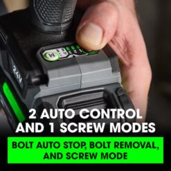 - AUTO CONTROL AND SCREW MODES – Bolt Auto Stop Mode prevents overtightening, breaking, or stripping; Bolt Removal Mode stops the tool when the bolt is loosened; Screw Mode delivers faster speed in wood-driving applications