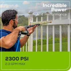 - Power: Powerful residential electric pressure washer with 2300 MAX PSI, 2.3 MAX GPM (GPM ranges from 1.2 GPM to 2.3 GPM with included nozzles)