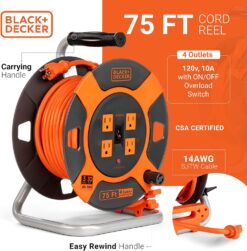 - Power where you need it: make sure you have plenty of outlets while working outside with this extension cord reel with four outlets from Black + Decker, this 75 ft. electric extension cord is CSA certified and has an on/off switch and light indicator