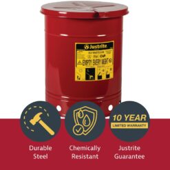 Revolutionize your workspace with an American-made Justrite oily waste can, a necessity in workshop accessories and auto shop supplies. Engineered for superior safety and durability, our oily waste can is an essential fireproof storage upgrade for any workshop, auto shop, or laboratory. Unlike a traditional metal trash can, our oily waste can features a self-closing lid that remains securely shut when not in use. This innovative design isolates its contents from potential fire sources and dramatically limits oxygen availability, minimizing the risk of spontaneous combustion. The can’s construction is robust, crafted from durable steel with a powder-coat finish for exceptional chemical resistance, far exceeding the capabilities of any other flammable storage can or fire safe trash can. Justrite oily waste cans are designed with an elevated base to promote air circulation around the can. This not only disperses heat but also minimizes moisture build-up and rusting. Additionally, the swinging carry handle makes it effortlessly portable, essential for dynamic and varied work environments. With FM and UL/ULC approvals, and OSHA compliance, our oily waste can provides a reliable, safe, and efficient solution for disposing of flammable waste. Choose a Justrite oily waste can for a safer and more efficient workspace, and elevate the standard of safety in your workshop or auto shop today. Founded in 1906, Justrite is a leading manufacturer of storage, handling, and workplace safety products. Today, Justrite is a global leader in the design and manufacturing of products for the safe management of flammable liquids and hazardous materials.