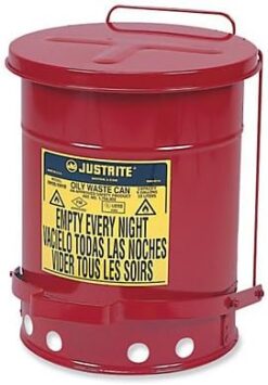 Justrite 09300 Oil Waste Can, Self-Closing, 10 Gal, Red, Rags and cloths soaked with solvents, thinners, linseed oil, combustible adhesives, and other flammable liquids present a serious fire risk when improperly discarded. Lid opens to no more than 60 degrees and stays closed when not in use, isolating contents from fire sources and limiting oxygen to virtually eliminate the risk of spontaneous combustion. Round construction and elevated base allow circulation of air around can to disperse heat and reduce moisture build-up and rusting. Durable steel construction with a powder-coat finish provides chemical resistance. Foot-operated self-closing lid, can for oily waste, Red. 10 gallon capacity.