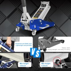 The Torin BIG RED T815016L-1 racing floor jack can be used for general or specialty use and features a 1.5 ton (3,000 lb) capacity. With a lift range between 3.5″ to 14″, you can gain easy access under low-profile vehicles. It’s constructed of durable, high-strength aluminum and steel, and is equipped with a handy side handle, making it easy to carry. A foam bumper on the handle helps protect your vehicle from damage. In terms of safety, this Torin service jack even comes with a built-in safety overload system which prevents use beyond load capacity. Includes a 1 year limited manufacturer warranty.