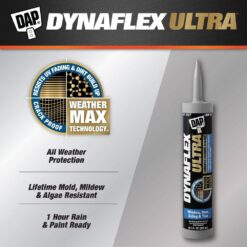 DAP Dynaflex Ultra Advanced Sealant for Window, Door, Siding & Trim applications is formulated with innovative Weather Max Technology to resist UV fading, chalking, crumbling, cracking and dirt build up. It also has a lifetime mold, mildew and algae resistance guarantee, so the sealant stays looking clean and new. Dynaflex Ultra has strong adhesion to common building materials and stays permanently flexible for a long-lasting, weatherproof seal that provides All Weather Protection and stands up to the elements. It is rain ready and paintable in one hour for better productivity. Waterproof sealant does not bubble, is low in odor and cleans up easily with water. DAP sealant guns out effortlessly and tools smoothly for easy application. Dynaflex Ultra meets ASTM C920, Class 35, is VOC compliant, and can be used on exterior and interior applications. DAP caulk and sealants provide durable performance for a variety of projects.