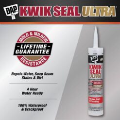 Dap Kwik Seal Ultra is a high-performance siliconized kitchen and bath sealant that repels water, stains and dirt and has a lifetime mold and mildew resistance guarantee so the sealant stays looking fresh and new. Kwik Seal Ultra Sealant applies white and dries clear in 7 to 14 days depending on joint depth, temperature and humidity. Sealant is 100% waterproof and crack proof and can be exposed to water in as little as 4 hours after application without washing out. It is easy to apply and tool and cleans up easily with water. Seal out water and moisture around sinks, tubs, showers, faucets, vanities, counter tops and fixtures. Works great for caulking and sealing in bathrooms or kitchens. Kwik Seal Ultra is not paintable but may be exposed to water in as little as 4 hours following application without washing out. DAP caulk and sealants provide durable performance for a variety of projects including bathroom caulk projects.