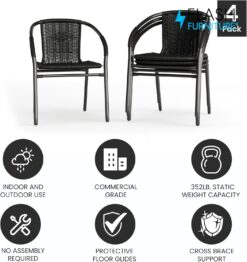 Flash Furniture Lila Modern Rattan Indoor/Outdoor Stackable Dining Chairs, Stacking Rattan Bistro Chairs for Patio or Restaurant, Set of 4, Black