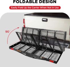 - FOLDING DESIGN: The receiver hitch cargo rack includes a folding tilt shank, which lets you fold up the cargo rack when not in use. The angled shank offers increased ground clearance, making this cargo hitch carrier versatile for various vehicle types