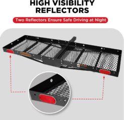 - INTEGRATED SAFETY: Drive confidently with the integrated reflectors on this hitch cargo rack. Designed for better visibility, these reflectors ensure that your cargo trailer or car hitch cargo carrier is clearly visible, increasing safety during nighttime or low-light driving conditions.