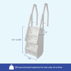 Introducing the Vinyl Works MODEL IN-24 Step Adjustable Above-Ground Pool Ladder, the ideal and reliable solution for ensuring a secure and effortless entry into your inviting backyard pool. Manufactured using maintenance free plastic to maintain strength and color. Stainless hardware is used for years of worry free use. This ladder’s versatile and robust design guarantees a comfortable fit over the walls of your above-ground pool, creating a safe passage for swimmers of all ages. The 2 rails, thoughtfully spaced 24 inches apart, provide steady support for individuals climbing in and out of the pool. To ensure a firm grip, each step is furnished with a textured surface. Whether your pool is spacious or more compact, this inclined design optimizes your pool space, boasting a footprint of just 22 inches that firmly anchors against any of the pool’s perimeter walls. The ladder is adjustable, extending up to a maximum height of 60 inches, and features 4 wide steps, ensuring a comfortable ascent and descent. At the top of this pool ladder, you’ll find deck flanges equipped with the necessary hardware to securely attach it to your pool deck, effectively supporting weights of up to 300 pounds. Smoothly rounded base allows the step to be stable and not damage the pool liner. A ladder or stair pad can be used for additional protection if desired (sold separately). The step system is designed to prevent entrapment while allowing great circulation of the pool water (both through the side frames and through the tread risers). The risers are embossed with no diving and no jumping signs for safety reminders. Enhance both pool safety and enjoyment while mitigating the risks associated with jumping and sliding by making the wise choice of installing the Vinyl Works Above-Ground Swimming Pool Ladder in your cherished backyard oasis.