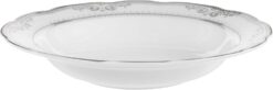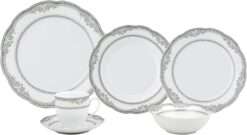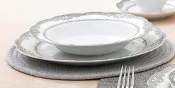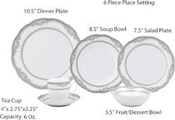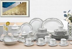 57 Piece Wavy Porcelain dinnerware set complete with a 6 piece place setting per person and serving pieces. Fine enough for formal dining, yet durable enough for daily casual use. This set features a Silver decorative border design. Dishwasher safe for easy cleap up. Serving pieces included will create a complete look on for your dining experience.