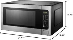 This Black+Decker microwave has 2. 2 cubic feet of space and 1, 200 watts of cooking strength. The stainless steel exterior and perfect size makes this the ideal unit for smaller kitchens, dorms, or office break rooms. It offers 10 different levels of power and features a bright green digital display with LED interior lighting. One-touch buttons help to make the food preparation quick and easy. There are multiple pre-programmed settings including: defrost, express cook, mute mode, and more! If you’re looking for an elegant and efficient all-in-one microwave, look no further.