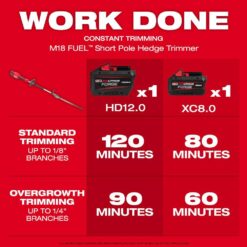 Designed with maneuverability in mind, the MILWAUKEE M18 FUEL Short Pole Hedge Trimmer provides the power to cut 1″ branches, has a lightweight design for quick shaping, and provides more maneuverability for clean cuts. This solution features robust 20″ double-sided blades for faster & more aggressive cutting in addition to a balanced design providing superior ergonomics in use. This Short Pole Hedge Trimmer includes a tip guard to prevent damage to the blade and surrounding work area, as well as a padded grip and bail handle grip for optimal hand placement and increased comfort. REDLINK PLUS Intelligence offers total system communication between tool and battery for unmatched levels of performance, protection, and productivity. When paired with the M18 REDLITHIUM FORGE XC8.0 Battery Pack (Not Included), this hedge trimmer provides users with up to 90 minutes of run time. The M18 FUEL Short Pole Hedge Trimmer is fully compatible with 275+ solutions on the M18 system.