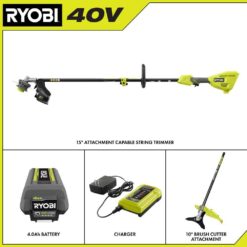 - Trimmer: Includes: RY40PH01 40V Power Head, A54ST01 Straight Shaft Trimmer Attachment, OP40404 40V 4Ah Battery, OP404 40V Charger, Front Handle, Grass Deflector, .080″ Replacement Line, and Operator’s Manuals