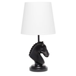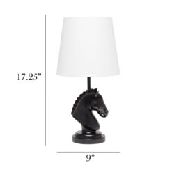 This Creatively Designed Table Lamp Base Is Shaped Similarly To That Of A Knight In Chess, With Lovely Detail Ranging From The Mane Down To The Mouth Of The Horse. Available In A Variety Of Base Finishes, All Pair Perfectly With The Tapered White Fabric Shade To Compliment Your Decor Or Act As An Accent Piece While Illuminating Your Space. Unique Lamp Style: Fun, Stylish, And Unique! A Lovely Horse Shaped Base In Black Stands On A Matching Round Base And Sits Beneath A Crisp White Fabric Shade Made Of Linen. Accessible Switch: An Easily Accessible Gear (Rotary) Switch Is Located On The Cord Of This Table Lamp To Allow A Quick And Easy On/Off Function As Needed. Lamp Is Also Equipped With A 5 Foot Black Plug In Cord Rooted At The Base, Perfect For Spaces That Need A Little Room Between The Outlet And Desired Location Of The Size: Overall Product Size Is L: 9″ X W: 9″ X H: 17.25″ And Weighs 2.43 Lbs. The Shade Of This Lamp Measures Dia: 9″ X H: 8″.Assembly & Use: Product Ships Assembled And Will Only Require You To Secure The Lamp Shade To The Base Using The Provided Socket Nut Prior To Use. Bulb Requirement Sold Separately: This Table Lamp Uses 1 X 40 Watt Type A19 E26 Medium Base Bulb, Which Is Not Included In Your Purchase But Can Be Easily Found Online Or Your Local Hardware Store. Additional Base Options Available: This Lamp Is Sold In Additional Base Color Options. If This Specific Color On The Base Doesn’T Perfectly Match Your Space, Make Sure To Check Out All Available Colors!