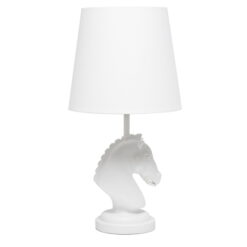 This Creatively Designed Table Lamp Base Is Shaped Similarly To That Of A Knight In Chess, With Lovely Detail Ranging From The Mane Down To The Mouth Of The Horse. Available In A Variety Of Base Finishes, All Pair Perfectly With The Tapered White Fabric Shade To Compliment Your Decor Or Act As An Accent Piece While Illuminating Your Space. Unique Lamp Style: Fun, Stylish, And Unique! A Lovely Horse Shaped Base In White Stands On A Matching Round Base And Sits Beneath A Crisp White Fabric Shade Made Of Linen. Accessible Switch: An Easily Accessible Gear (Rotary) Switch Is Located On The Cord Of This Table Lamp To Allow A Quick And Easy On/Off Function As Needed. Lamp Is Also Equipped With A 5 Foot White Plug In Cord Rooted At The Base, Perfect For Spaces That Need A Little Room Between The Outlet And Desired Location Of The Size: Overall Product Size Is L: 9″ X W: 9″ X H: 17.25″ And Weighs 2.43 Lbs. The Shade Of This Lamp Measures Dia: 9″ X H: 8″.Assembly & Use: Product Ships Assembled And Will Only Require You To Secure The Lamp Shade To The Base Using The Provided Socket Nut Prior To Use. Bulb Requirement Sold Separately: This Table Lamp Uses 1 X 40 Watt Type A19 E26 Medium Base Bulb, Which Is Not Included In Your Purchase But Can Be Easily Found Online Or Your Local Hardware Store. Additional Base Options Available: This Lamp Is Sold In Additional Base Color Options. If This Specific Color On The Base Doesn’T Perfectly Match Your Space, Make Sure To Check Out All Available Colors!