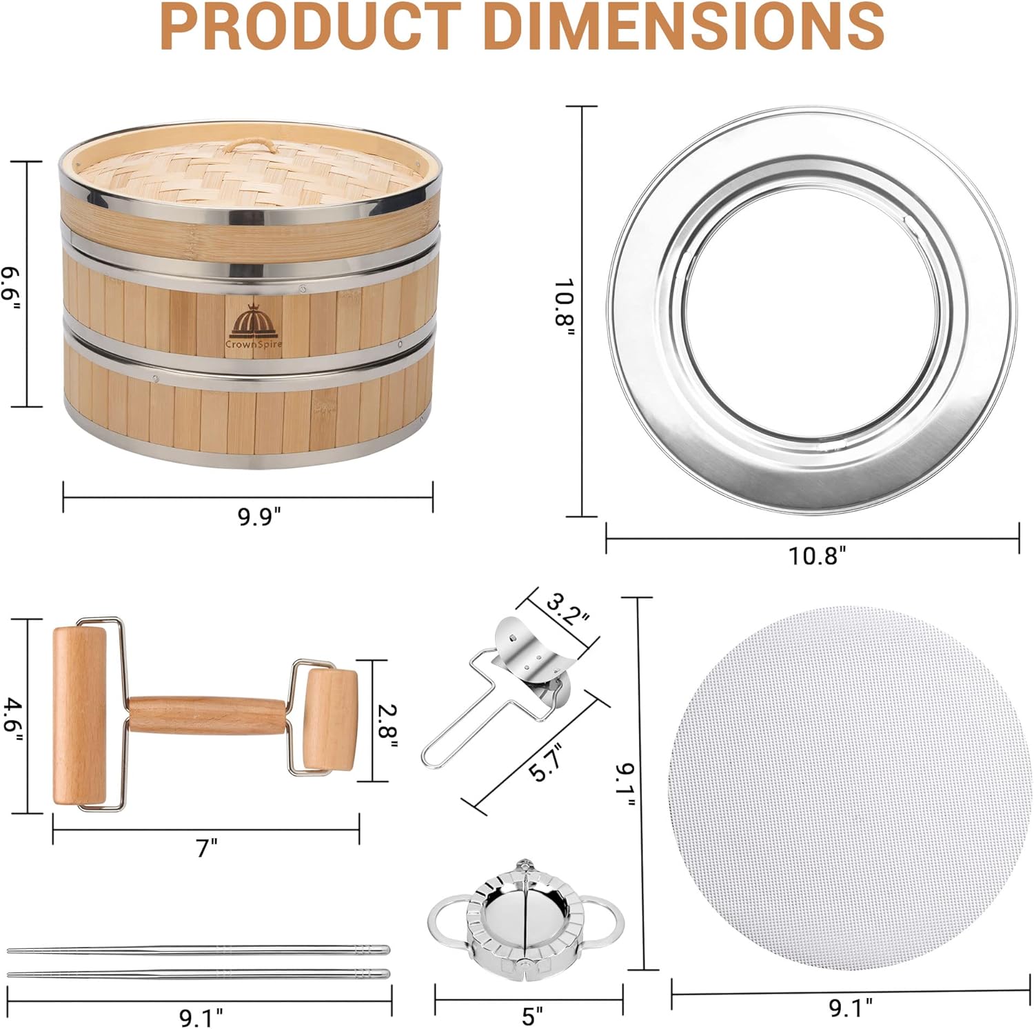 - Complete Set: Steam basket comes with 2 bamboo steamer baskets, stainless steel adapter ring (fits 8″-11″ pots and pans), 1 dumpling mold, 1 dumpling skin cutter, 4 stainless steel chopsticks, and 2 silicone pads