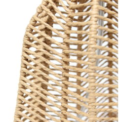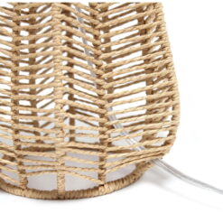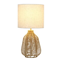 Layers of horizontal linear patterns made primarily of paper rope and metal create the impression and style of this vintage inspired table lamp. Paired with a light beige linen shade, this combination is bound to compliment the existing fashion upheld in your home. This is the perfect piece to accent your home decor, whether in your living room, on your nightstand in your bedroom, or office! Light beige linen shade. Natural base of paper rope. Features a rotary switch on socket for convenience. Shade measures D: 10.25″ x H: 9″. Features a 60″ clear plug in cord. Alternate base color available. Base Type: E26 Medium Base. Base Dimensions: L: 8 x W: 8 x H: 10.75. Height from Base to Shade: 11.625. Height from Base to Socket + Socket: 11.75 + 2.875. Bulb Included: No. Weighted Base: No. Does the item contain wood: No. Replacement Parts Available: Yes.