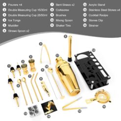 | Included Components | 25 oz Shaker Tins, 4 Pourers, Double Measuring Cup 15/30ml & 25/50ml, an Ice Tongs, a Muddler, 2 Straws Spoon, 2 Bent Straws, a Corkscrew, a Brushes, a Mixing Spoon, 4 Stainless Steel Stones, a Cocktail Recipe, a Stones Clip, a Strainer, an Acrylic Stand |