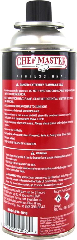 - RELIABLE FUEL FOR CAMPING STOVES, TORCHES & OUTDOOR COOKING – Upgrade your outdoor cooking experience with this 24-pack of high-quality butane fuel canisters, designed for consistent performance in portable stoves, butane torches, and culinary tools. Specifically crafted for seamless compatibility with Chef Master butane stoves, these 8 oz canisters provide a steady, high-powered flame for camping, backpacking, catering, and emergency preparedness. Whether you’re searing meats, caramelizing crème brûlée, or cooking meals.