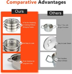 - Three-layer Design: This stainless steel steamer consists of a pan and 2 steamers, which can be freely matched to cook as you wish. As we all know, steaming is the cooking method that maintains the most nutrients and the most original flavor of food. So no matter for nutrition or health, the steamer is essential for you.
