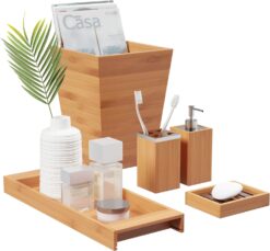 - SIMPLE STYLE – This bathroom accessory set’s modern, contemporary design and natural bamboo look easily complements any powder room decor and furnishings. Keep this hassle-free set for yourself or give it to someone as the perfect housewarming gift.