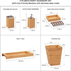 5-Piece Bathroom Decor Set – Bamboo Vanity Accessories with Trash Bin, Soap Dish, Soap Dispenser, Toothbrush Holder, and Tray by Lavish Home (Natural)
